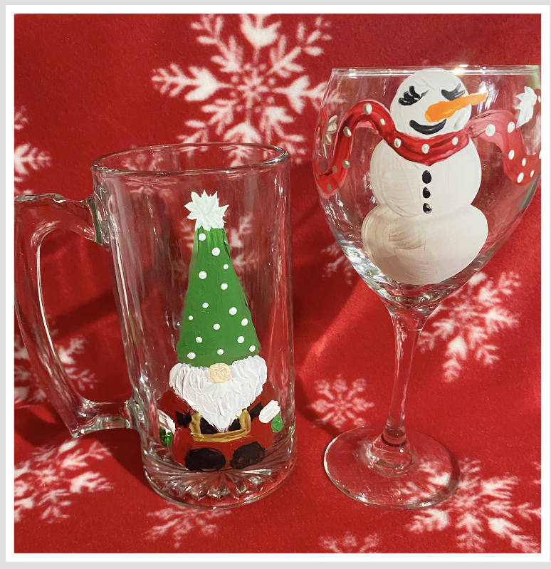 Gnomes and snowmen are what will be guided instruction for painting on the glasses however feel free to be as crafty and creative as you like! Paint color options will be available for adding your own flair to the glasses.