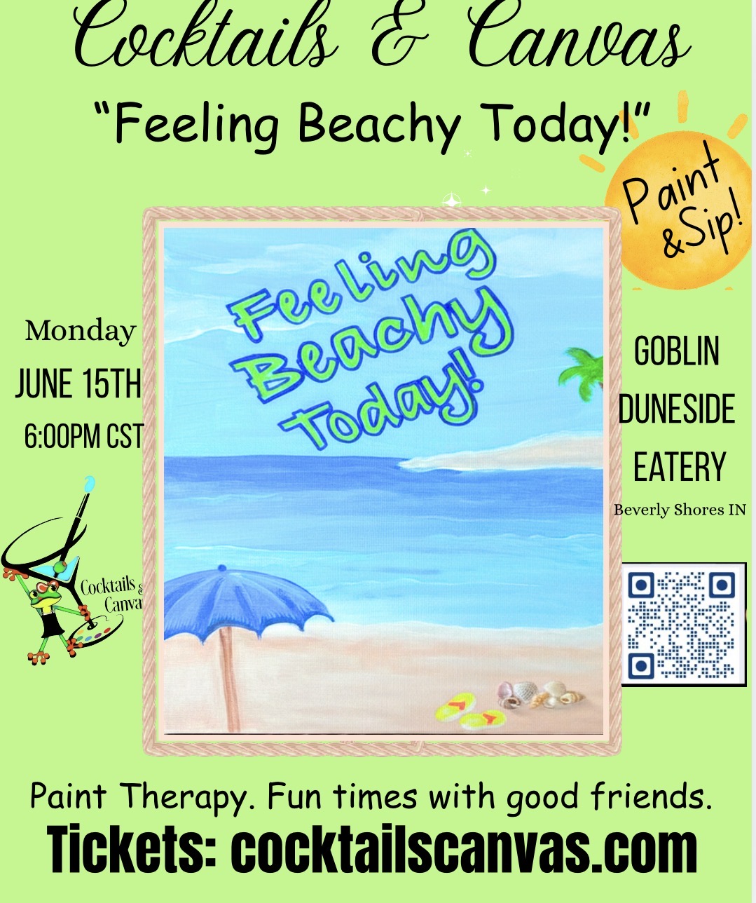 Join us at the beautiful Goblin & Grocer Duneside Eatery in Beverly Shores IN. on Monday June 15th at 6:00pm for a fun time painting "Feeling Beachy Today!".  We will […]
