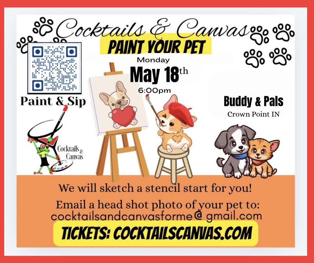 Join us at our "Paint Your Pet" exclusive painting event at Buddy & Pals Place in Crown Point Indiana. Bring your friends or come solo to meet new friends! No experience necessary. We will walk you through every step of the way, no stress all fun! This special event comes with a rough draft stencil start […]
