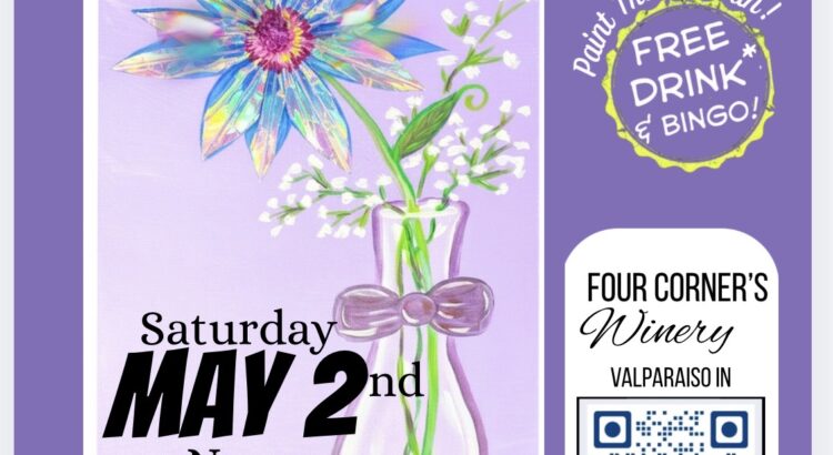 Join us in painting the beautiful prismatic rainbow “Glass Flower” painting event at the Four Corner’s Winery & Wedding Venue in Valparaiso Indiana. Bring your friends or come solo to meet new friends! No experience necessary. We will walk you through every step of the way, no stress all fun!