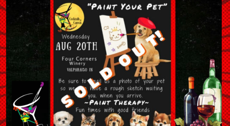 Join us at our “Paint Your Pet” painting event at the beautiful Four Corners Winery in Valparaiso Indiana. Bring your friends or come solo to meet new friends! No experience necessary. We will walk you through every step of the way, no stress all fun!