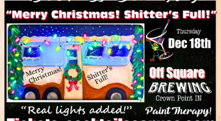 Join us at our festive “Merry Christmas! Shitter’s Full” Christmas Cocktails and Canvas Painting Event at Off Square Brewing in Crown Point Indiana. Bring your friends or come solo to meet new friends! No experience necessary. We will walk you through every step of the way, all fun, no stress! This painting comes with a real strand of lights with batteries already provided for you too! You can bend and shape the lights to run the strand across the camper as well as onto the trees on either side of camper too. Such a cute and nostalgic Christmas painting! Sure to be the talk of all your Christmas guests!