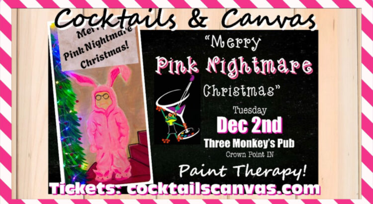 Join us in a festively fun time painting “Merry Pink Nightmare Christmas!” at the Three Monkey’s Pub in Crown Point Indiana. Bring your friends or come solo to meet new friends! No experience necessary. We will walk you through every step of the way, no stress all fun! This painting comes with a real string of Christmas lights for the Christmas tree as well as a real miniature pair of black wired glasses to affix on Ralphy’s face. Such a cute as well as nostalgic painting to create and hang to display for many years to come. We will have a rough stencil of the famous bunny suit already on your canvas when you arrive to make painting this a breeze!
