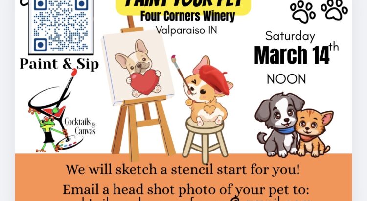 Join us at our “Paint Your Pet” exclusive painting event at the Four Corner’s Winery & Wedding Venue in Valparaiso Indiana. Bring your friends or come solo to meet new friends! No experience necessary. We will walk you through every step of the way, no stress all fun! This special event comes with a rough draft stencil start of your favorite pet. Be sure to send us a headshot photo so we can have this sketch ready for you when you arrive. Email: cocktailsandcanvasforme@gmail.com